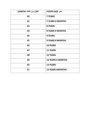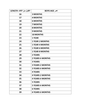 8 أشهر, 10 أشهر, سنة وشهرين, سنة و6 أشهر, سنتان, 3 سنوات, 3 سنوات ونصف, 4 سنوات, 5 سنوات, 6 سنوات, 7 سنوات, 8 سنوات, 9 سنوات, 10 سنوات, 12 سنة, 13 سنة |