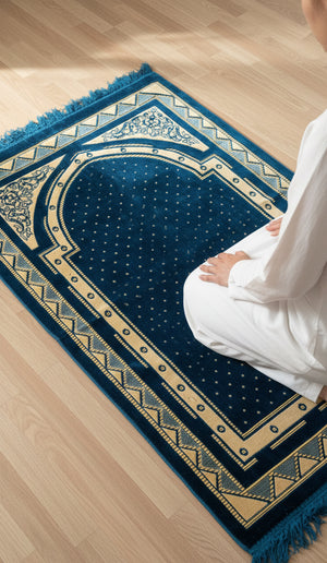 سجادة صلاة زرقاء ناعمة وأنيقة، مصممة لتوفير أقصى درجات الراحة والتركيز أثناء الصلاة. نسيج ناعم مع حشوة إسفنجية لراحة إضافية.
