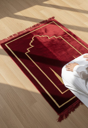 سجادة صلاة حمراء ناعمة وأنيقة، مصممة لتوفير أقصى درجات الراحة والتركيز أثناء الصلاة. نسيج ناعم مع حشوة إسفنجية لراحة إضافية.