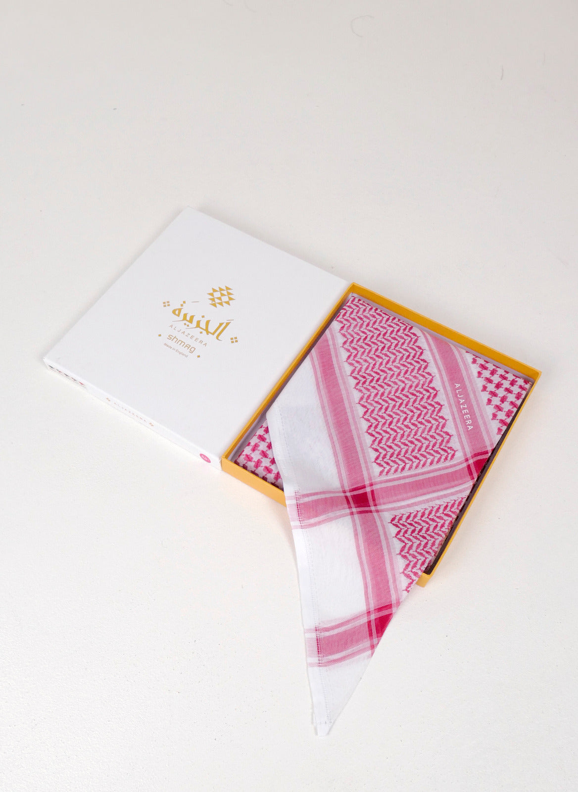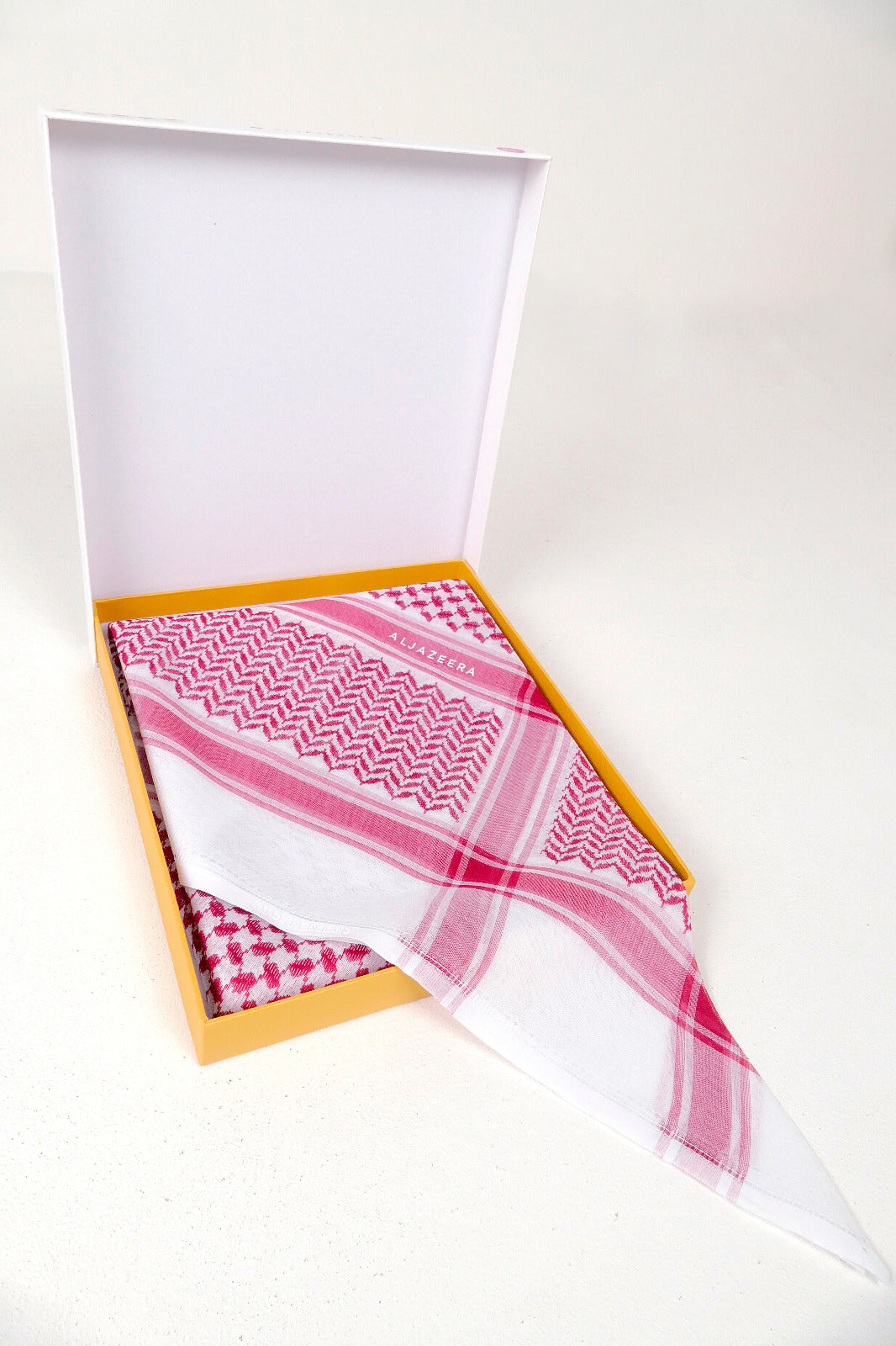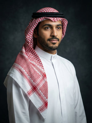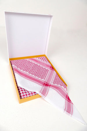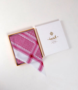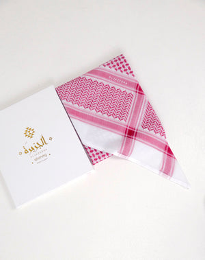 غطاء رأس منقوش، عادةً ما يكون باللونين الأحمر والأبيض أو الأسود والأبيض، يعكس ثقافة المنطقة العربية، ويختلف ارتداؤه باختلاف المناطق، ليمنحها أقصى درجات الراحة في الطقس الحار. تصميمه الأنيق والراقي يمنحها مظهرًا أنيقًا وعصريًا للارتداء اليومي.