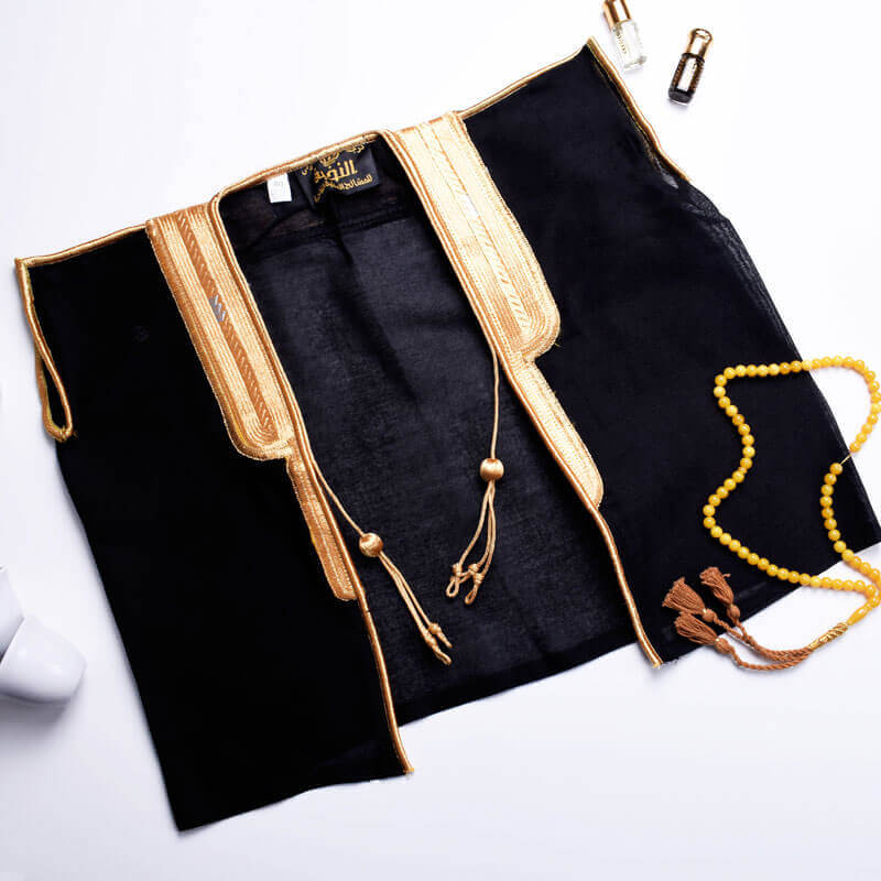 A flowing, traditional cloak worn over the dishdasha, usually on formal occasions. made from fine fabric with gold or silver trim, it signifies status, dignity, and cultural pride. for ultimate comfort in hot weather. Its crisp, clean design offers a cool and elegant look for everyday wear.