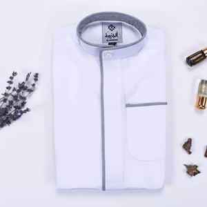 A distinctive traditional dishdasha featuring vibrant embroidered linings on the chest, adding a unique touch of elegance and cultural artistry. for ultimate comfort in hot weather. Its crisp, clean design offers a cool and elegant look for everyday wear.