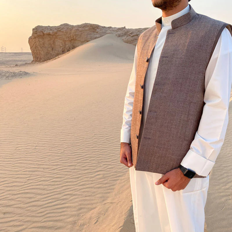 A sleeveless garment designed to provide extra warmth and layering during cold weather, often worn over traditional attire or casual clothing for ultimate comfort. Its crisp, clean design offers a cool and elegant look for everyday wear.
