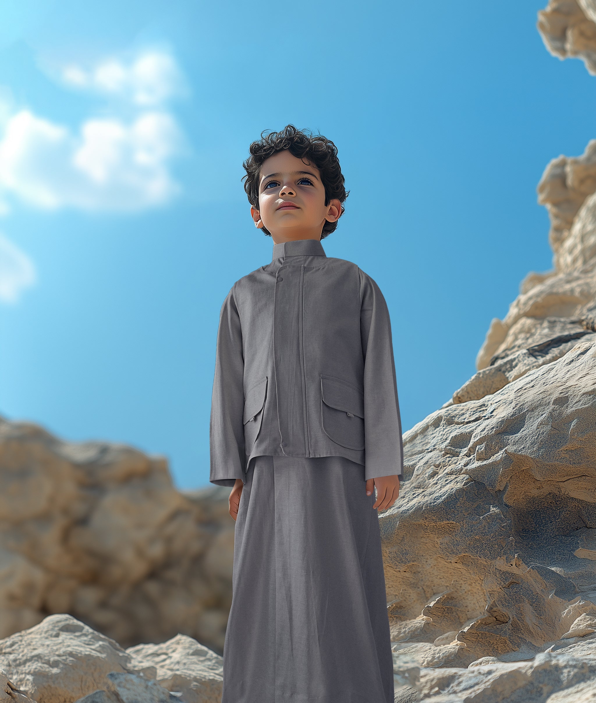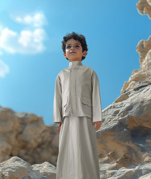 Introducing our elegant linen dishdasha set for boys, the perfect blend of tradition and comfort. Crafted from premium linen fabric, the set includes a matching vest and bag, designed to keep your child looking stylish and feeling comfortable for any occasion.