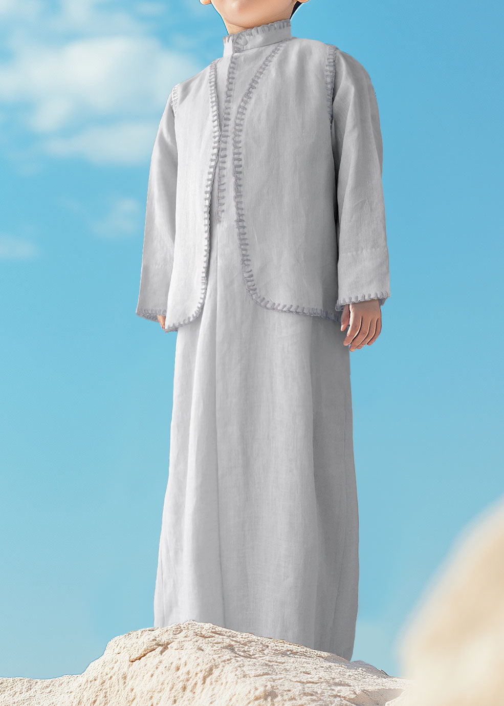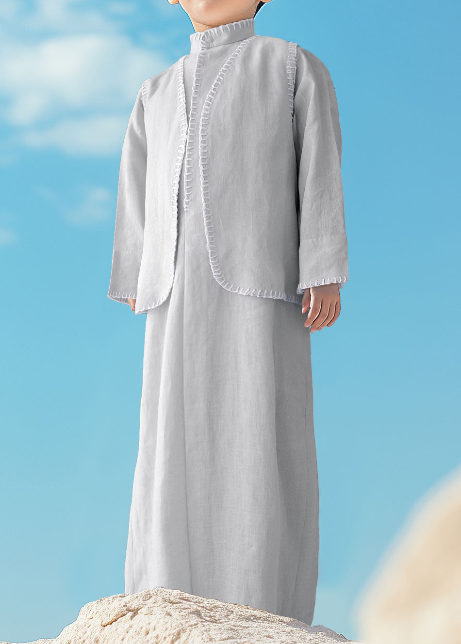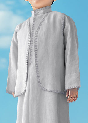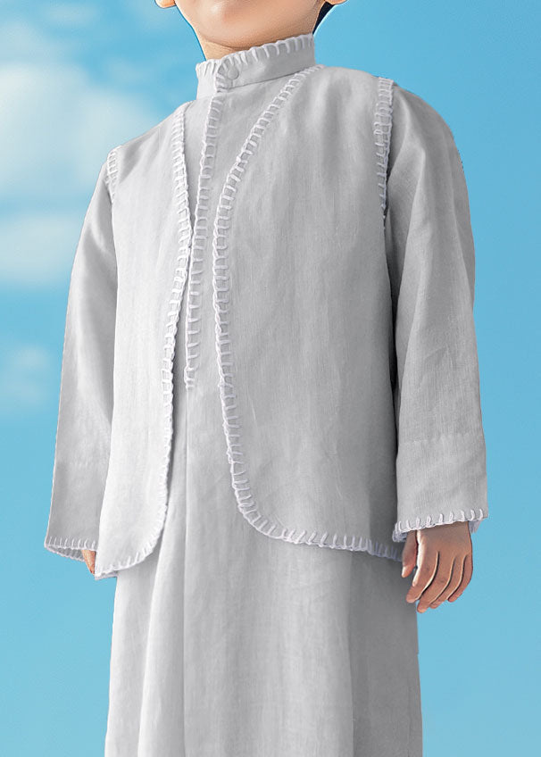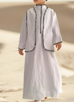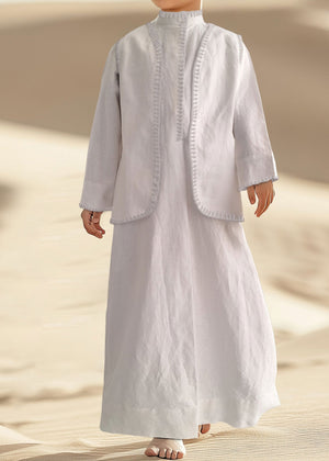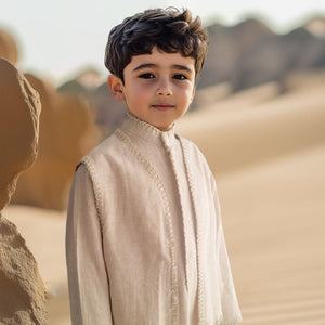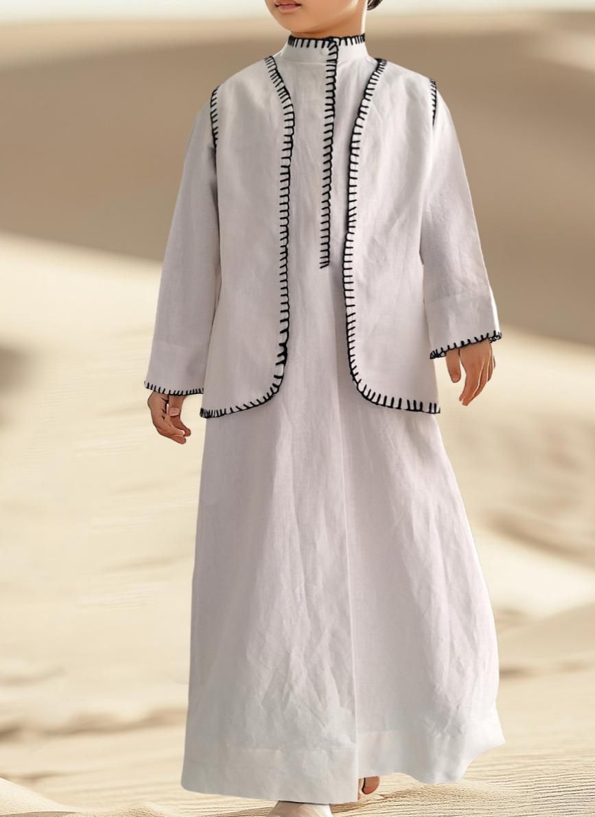 Introducing our elegant linen dishdasha set for boys, the perfect blend of tradition and comfort. Crafted from premium linen fabric, the set includes a matching vest and bag, designed to keep your child looking stylish and feeling comfortable for any occasion.