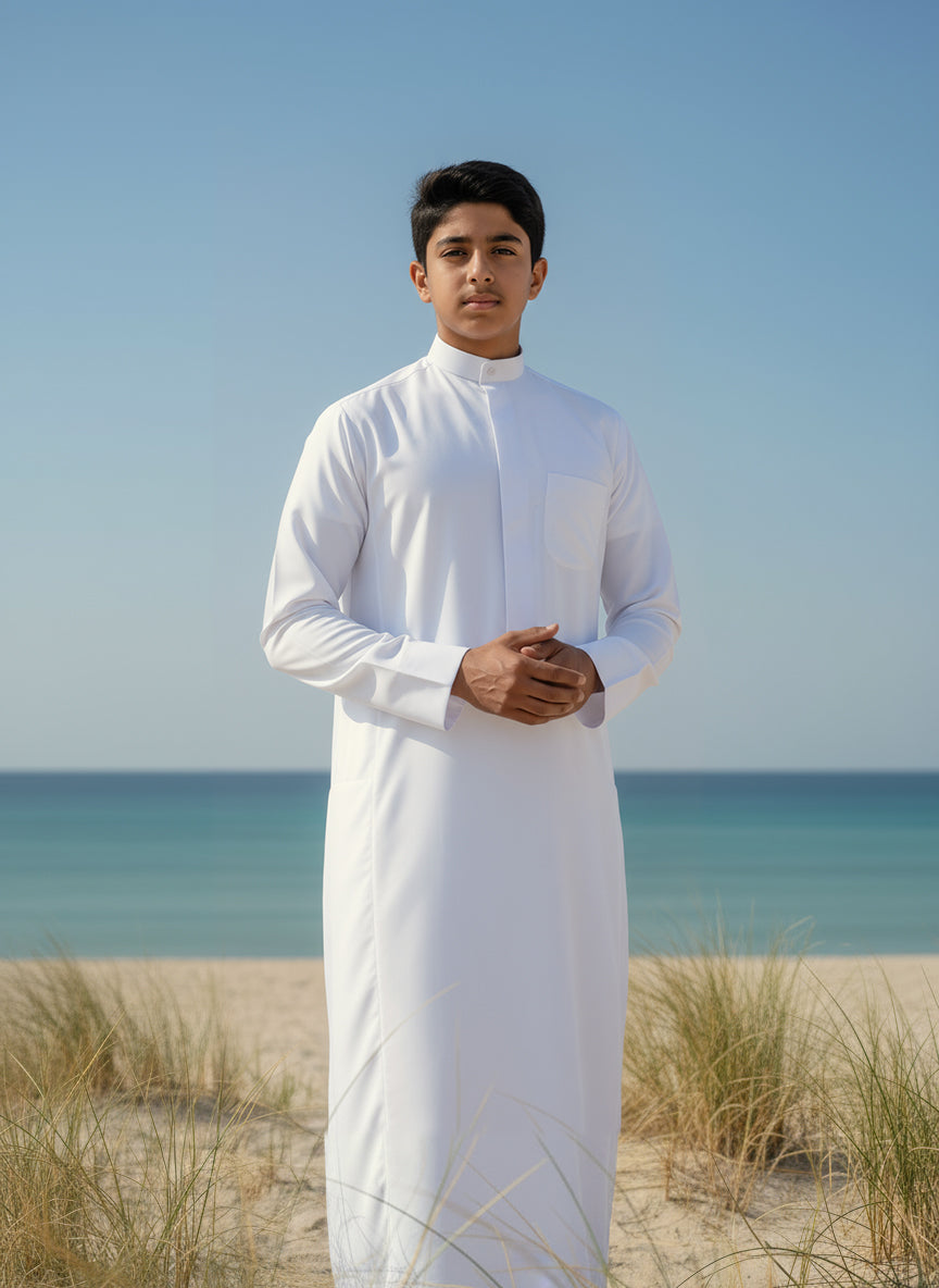 A lightweight, breathable white dishdasha designed for hot weather, offering comfort and a crisp, clean look ideal for summer days. for ultimate comfort in hot weather. Its crisp, clean design offers a cool and elegant look for everyday wear.