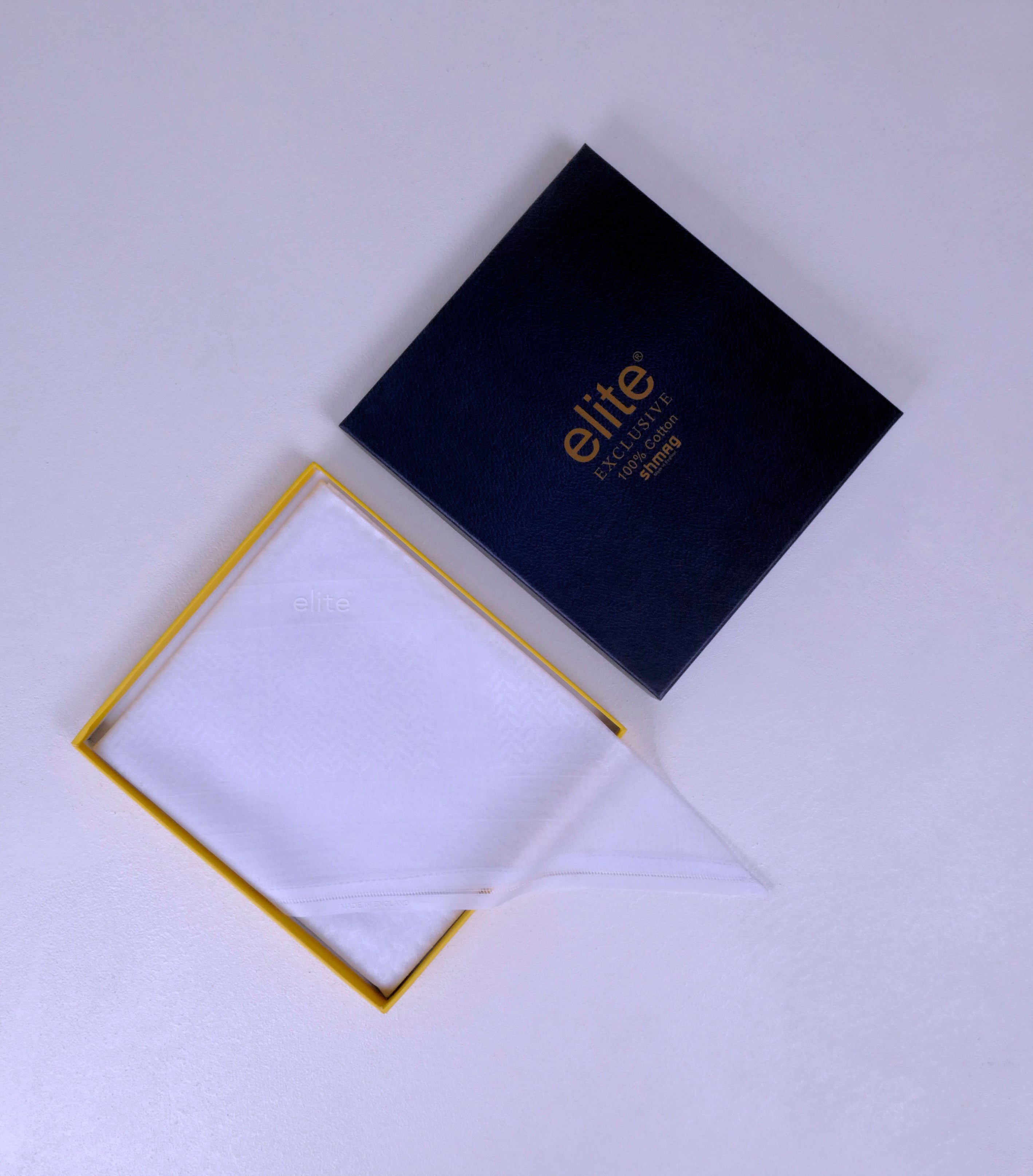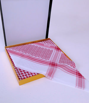 غطاء رأس منقوش، عادةً ما يكون باللونين الأحمر والأبيض أو الأسود والأبيض، يعكس ثقافة المنطقة العربية، ويختلف ارتداؤه باختلاف المناطق، ليمنحها أقصى درجات الراحة في الطقس الحار. تصميمه الأنيق والراقي يمنحها مظهرًا أنيقًا وعصريًا للارتداء اليومي.