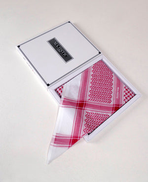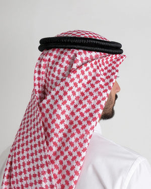 غطاء رأس منقوش، عادةً ما يكون باللونين الأحمر والأبيض أو الأسود والأبيض، يعكس ثقافة المنطقة العربية، ويختلف ارتداؤه باختلاف المناطق، ليمنحها أقصى درجات الراحة في الطقس الحار. تصميمه الأنيق والراقي يمنحها مظهرًا أنيقًا وعصريًا للارتداء اليومي.